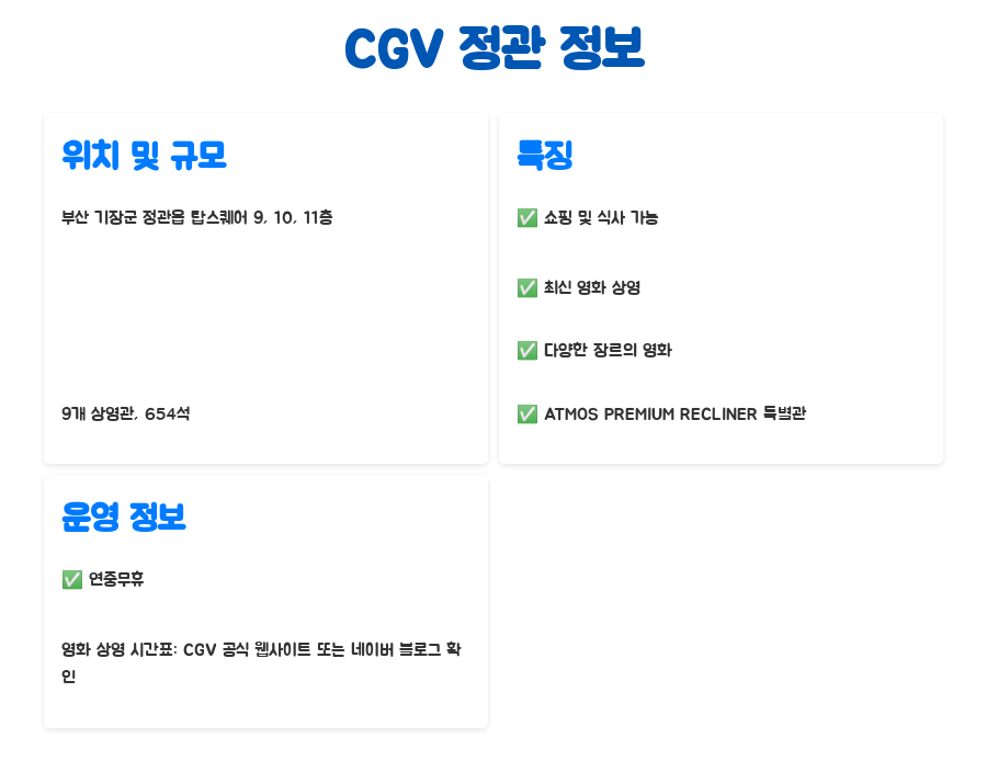 오늘 알아본 내용 어떠셨나요? 정관 CGV에서 상영하는 영화 정보를 확인하고, 편리한 주차 정보와 꿀팁들을 활용하여 더욱 즐거운 영화 관람 시간을 보내시길 바랍니다! 다음에도 유용한 정보들을 가지고 돌아오겠습니다. 다른 영화 정보나 궁금한 점이 있다면 언제든지 댓글 남겨주세요! 혹시 더 다양한 부산 지역 영화관 정보가 필요하시다면, 블로그 내 다른 게시글도 참고해보세요!
