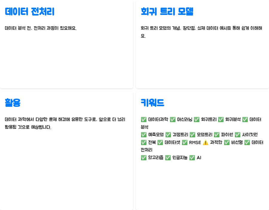 - 불안정성: 데이터가 조금만 바뀌어도 모델의 구조가 크게 달라질 수 있어요. 마치 모래성처럼, 조금만 건드려도 무너질 수 있는 것처럼, 회귀 트리 모델도 데이터 변화에 민감하다는 뜻이죠.
