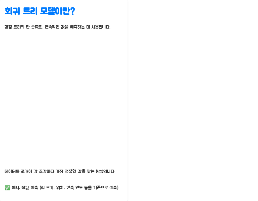 이 글에서는 회귀 트리 모델이 뭔지, 어떻게 작동하는지, 어떤 장단점을 가지고 있는지, 그리고 실제로 어떻게 활용되는지 알기 쉽게 설명해드릴게요.