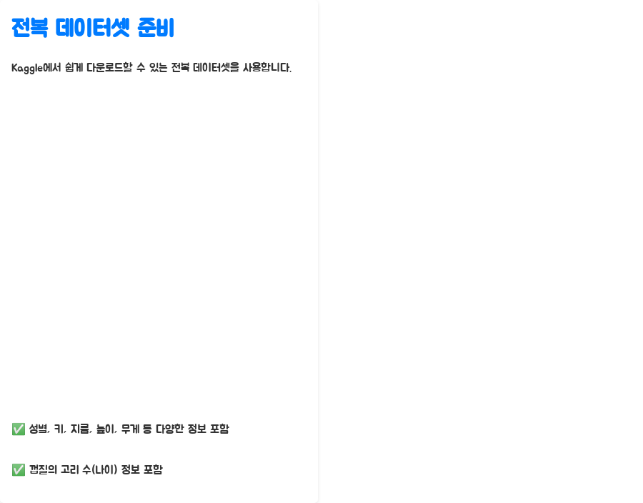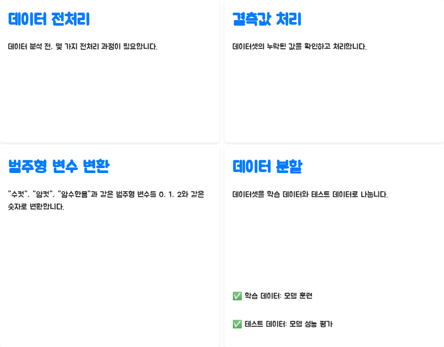 - 데이터 분할: 데이터셋을 학습 데이터와 테스트 데이터로 나눕니다. 학습 데이터는 모델을 훈련하는 데 사용하고, 테스트 데이터는 훈련된 모델의 성능을 평가하는 데 사용합니다.
