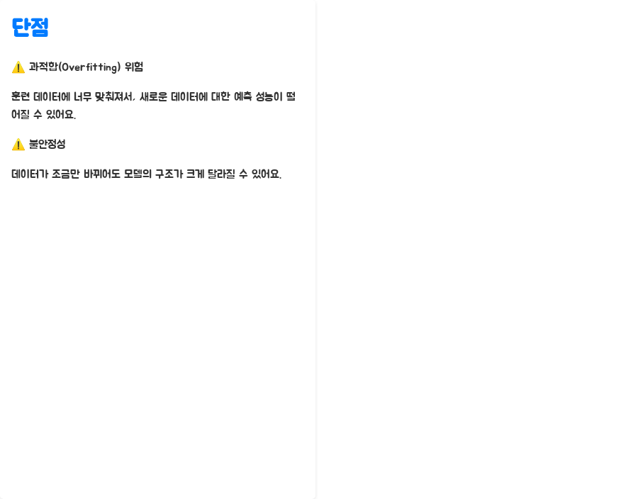 - 과적합(Overfitting) 위험: 훈련 데이터에 너무 맞춰져서, 새로운 데이터에 대한 예측 성능이 떨어질 수 있어요. 마치 암기만 잘하는 학생처럼, 훈련 데이터에는 잘 맞지만, 새로운 문제에는 적용하지 못하는 것과 같은 맥락이죠.