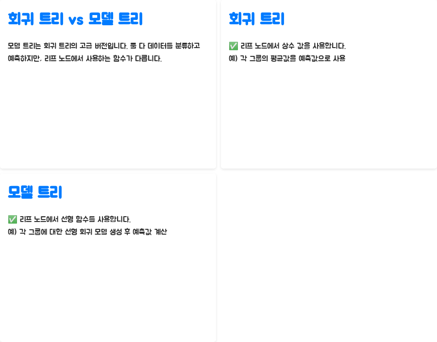 [그림 삽입]: 회귀 트리와 모델 트리의 잎 노드 차이를 보여주는 그림을 삽입합니다. 예를 들어, 회귀 트리는 잎 노드에 "예측값: 5억원"처럼 상수 값을 표시하고, 모델 트리는 "예측값: 2천만원 * 크기 + 1억원"처럼 선형 함수를 표시합니다.