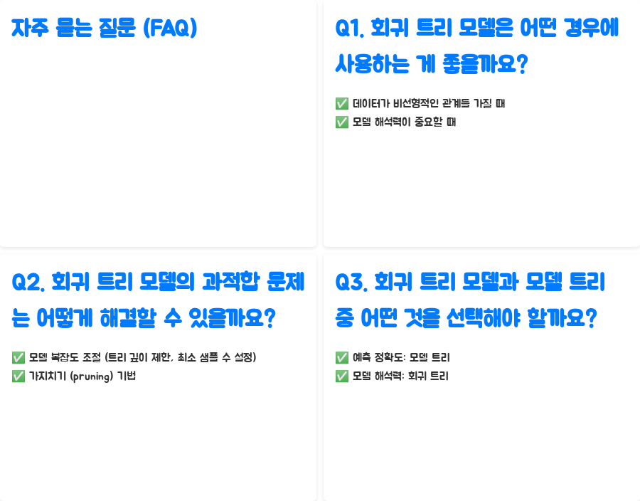 A1. 데이터가 비선형적인 관계를 가지고 있고, 모델의 해석력이 중요할 때 회귀 트리 모델을 사용하는 것이 좋습니다. 특히, 데이터를 시각적으로 이해하고, 특정 변수가 결과에 미치는 영향을 파악하고 싶을 때 유용합니다.