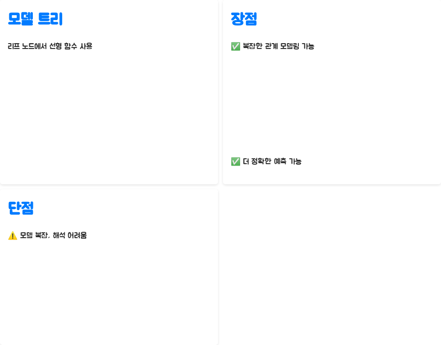 모델 트리는 리프 노드에서 선형 함수를 사용하기 때문에, 회귀 트리보다 더 복잡한 관계를 모델링할 수 있습니다. 덕분에 더 정확한 예측이 가능하죠. 하지만, 모델이 복잡해지면 해석이 어려워지는 단점도 있습니다.