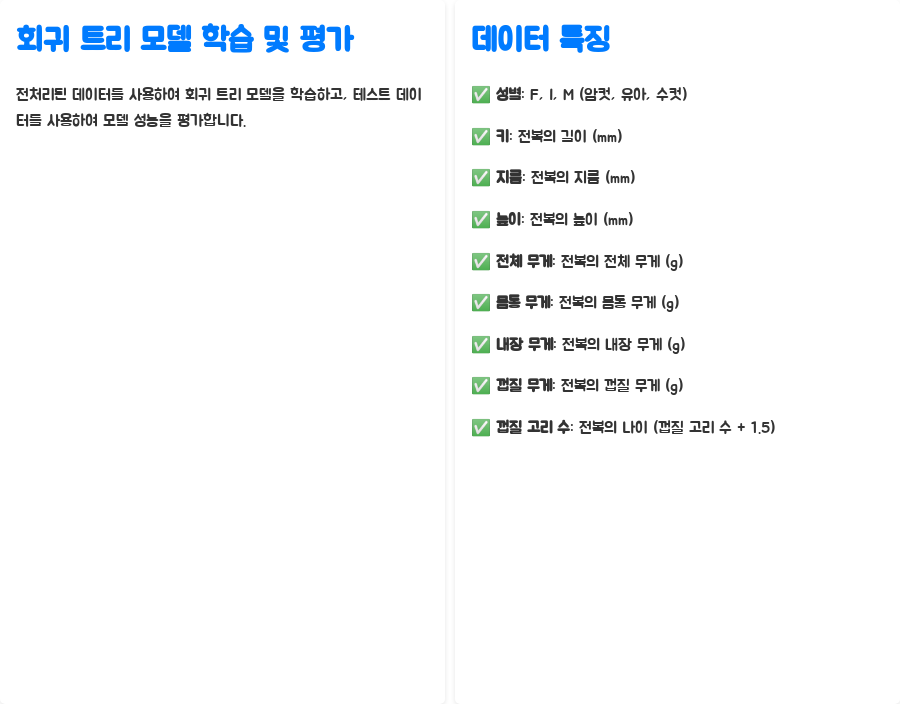 이제, 실제 데이터를 활용하여 회귀 트리 모델을 적용해 보는 예시를 소개해 드릴게요. 바로 전복의 나이를 예측하는 문제입니다!