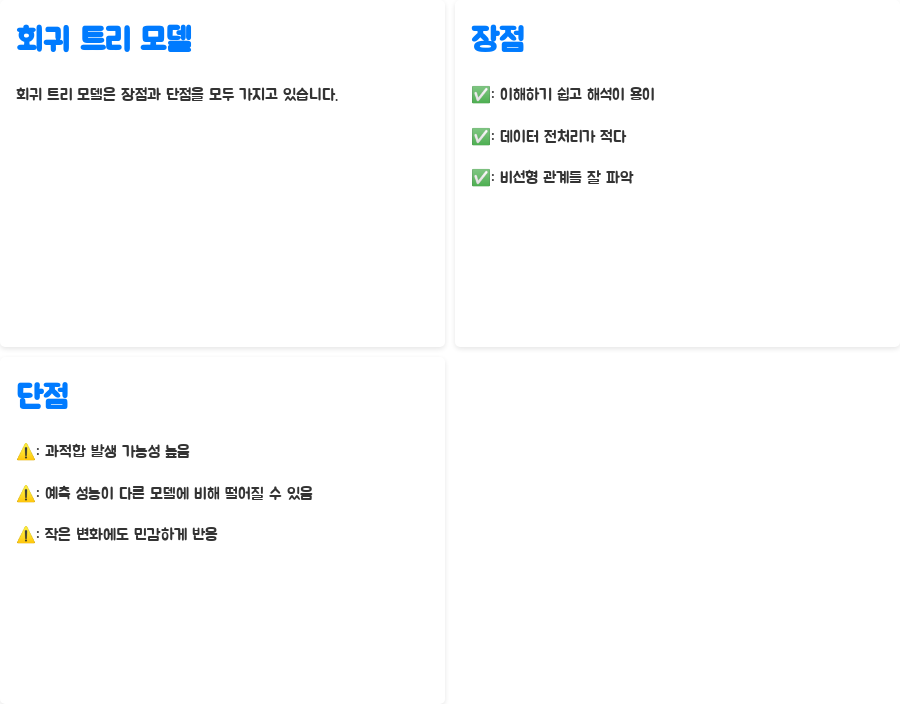 회귀 트리 모델은 장점도 많지만, 단점도 존재합니다. 어떤 상황에 적합한 모델인지 판단하기 위해서는 장단점을 잘 이해하는 것이 중요해요.