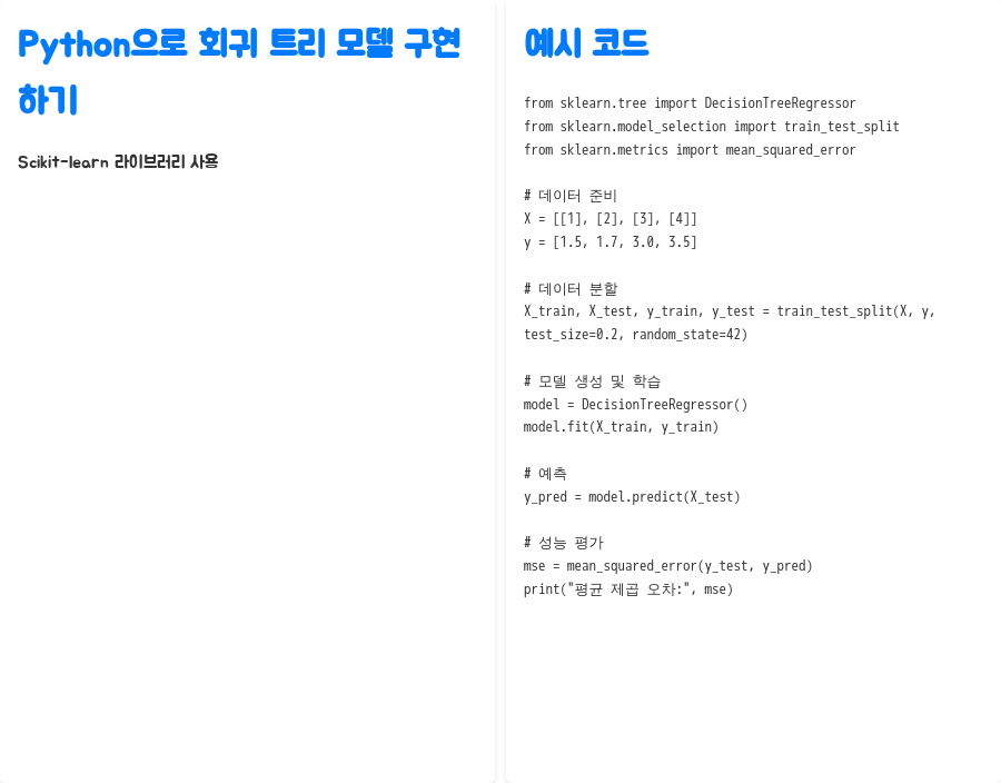 Python의 Scikit-learn 라이브러리를 사용하면 회귀 트리 모델을 쉽게 구현할 수 있습니다. 아래는 간단한 예시 코드입니다.