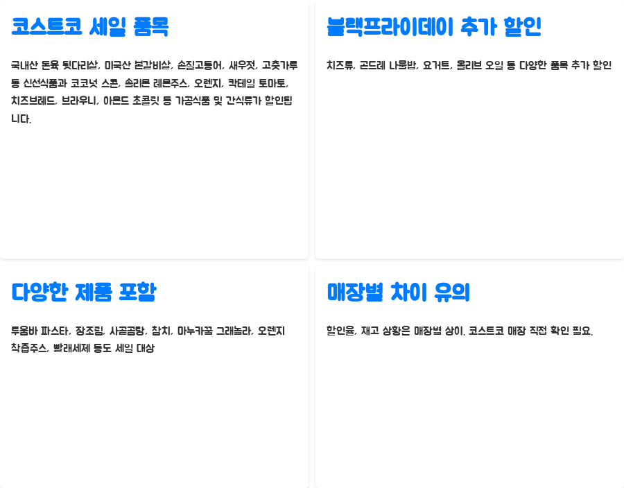 각 품목별 할인율과 재고 상황은 매장별로 다를 수 있으니, 가까운 코스트코 매장에 방문하여 직접 확인하시기 바랍니다.