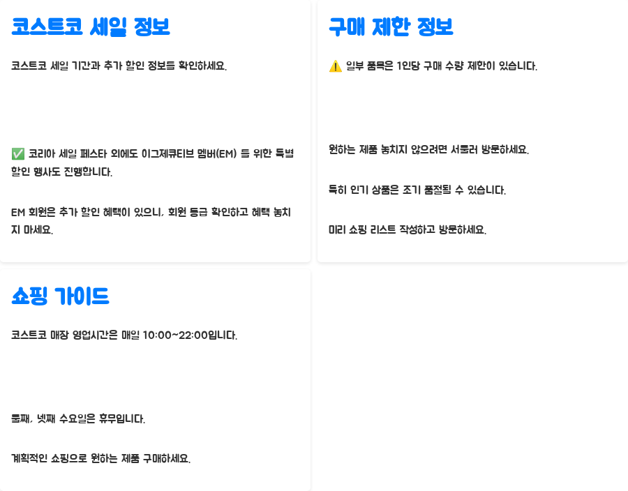 이 기간 동안 코스트코 매장은 평소보다 더욱 붐빌 것으로 예상되니, 여유로운 시간을 확보하고 방문하는 것이 좋습니다.