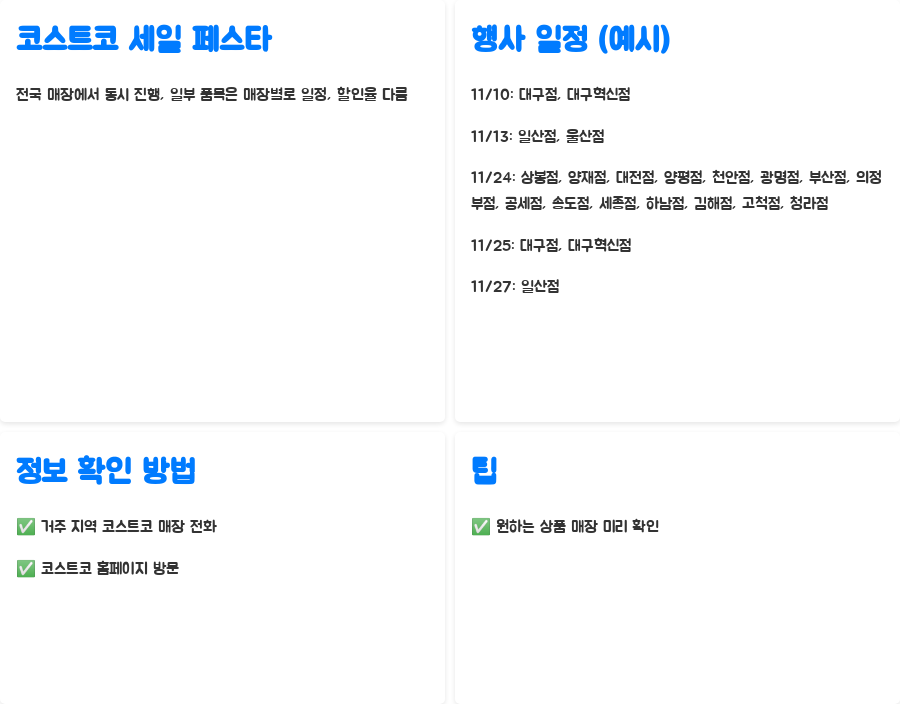 코스트코 세일 페스타는 전국 매장에서 동시에 진행되지만, 일부 품목의 경우 매장별로 행사 기간이나 할인율이 다를 수 있습니다.
