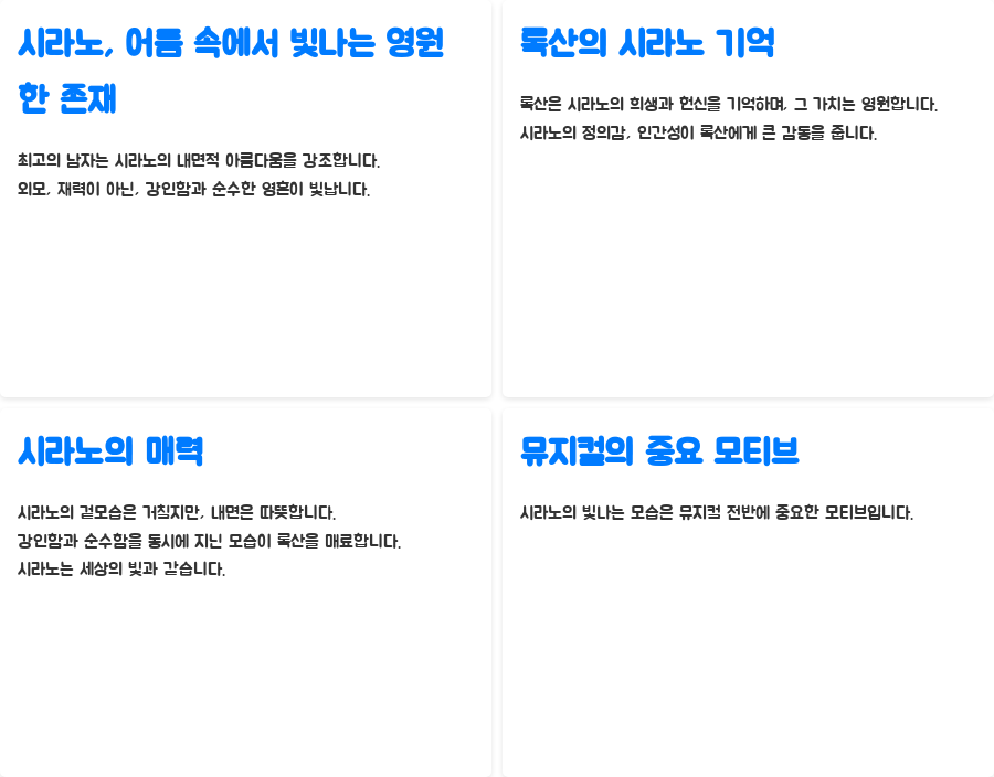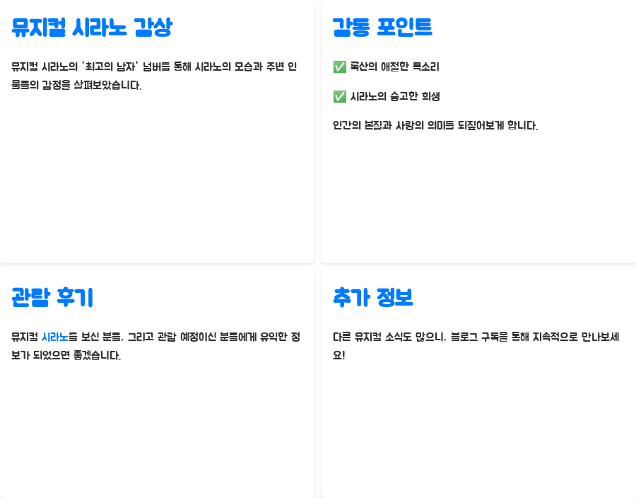 오늘 우리는 뮤지컬 <시라노>의 감동적인 넘버 '최고의 남자'를 통해 시라노의 진정한 모습과 그를 둘러싼 인물들의 감정을 살펴보았습니다.