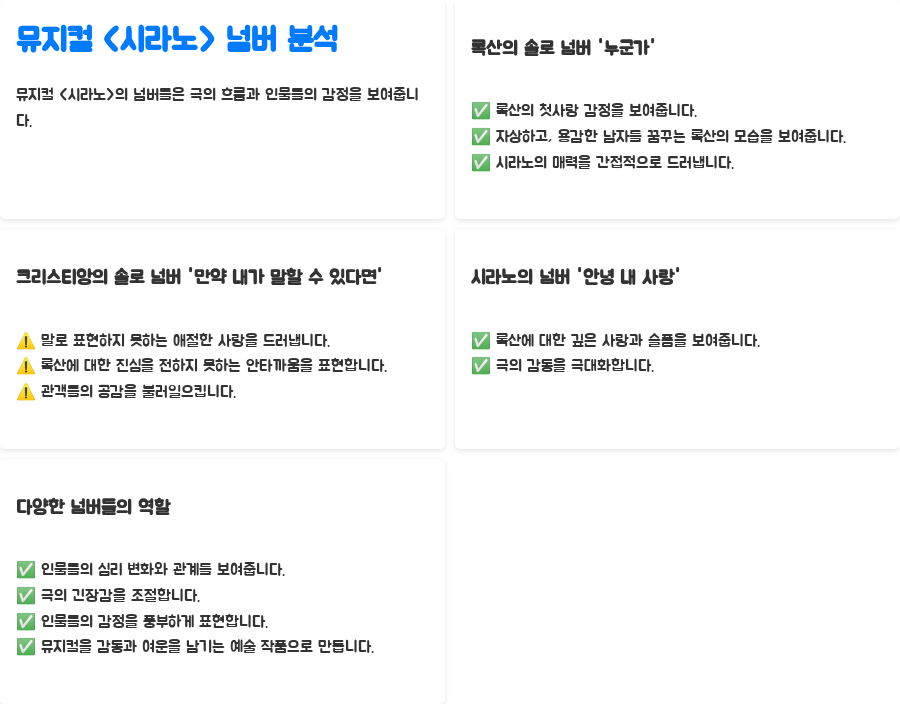 뮤지컬 <시라노>의 넘버들은 극의 흐름과 인물들의 감정을 생생하게 전달하는 중요한 요소입니다.