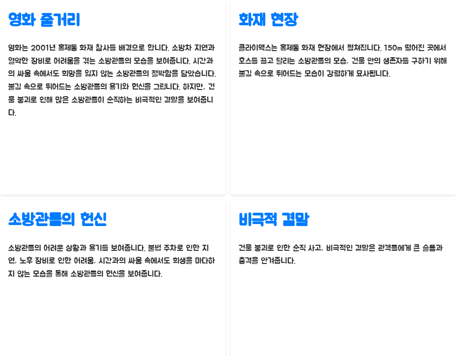 | 주요 내용 | 2001년 홍제동 화재 참사를 바탕으로 한 소방관들의 희생과 헌신을 그린 실화 영화 |