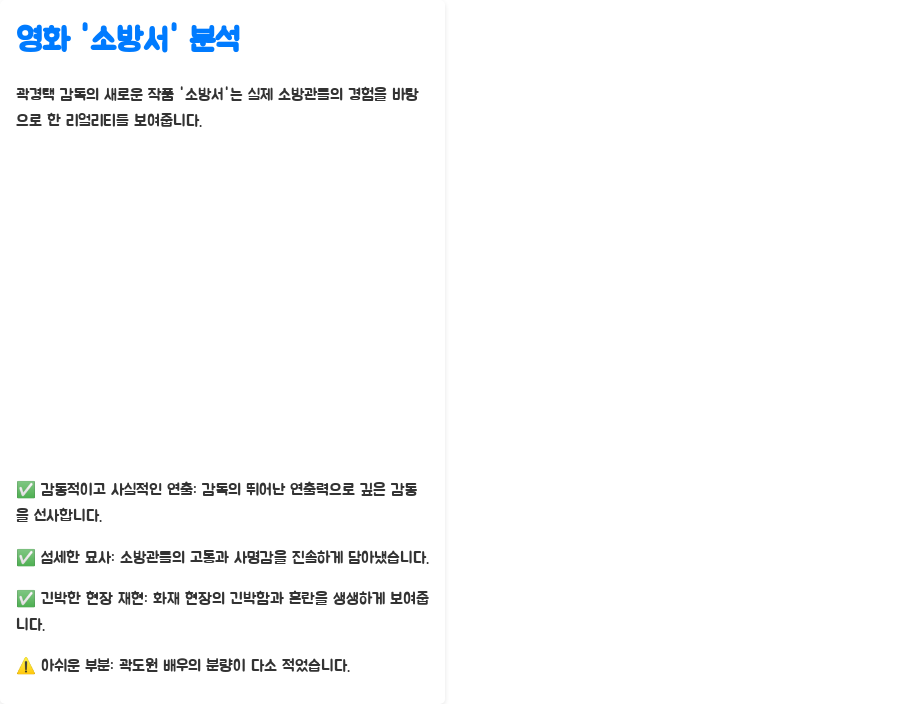 영화를 통해 우리는 소방 안전에 대한 경각심을 높이고, 안전한 사회를 만들기 위한 노력을 다짐해야 합니다.