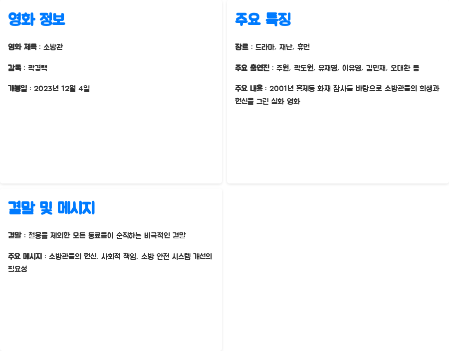 영화 ‘소방관’은 단순한 재난 영화를 넘어, 소방관들의 희생과 헌신을 깊이 있게 조명하는 작품입니다.